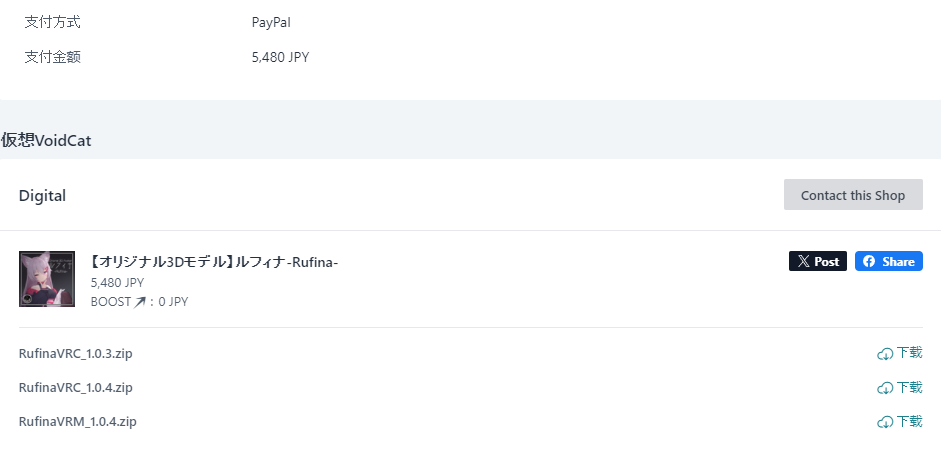 得益于PayPal的支持,booth的付款及购买流程都非常顺畅,值得注意的是在选购衣服的时候应当先查看好支持角色里面有无你之前购买的角色,否则后续可能会造成穿模等奇奇怪怪的bug。