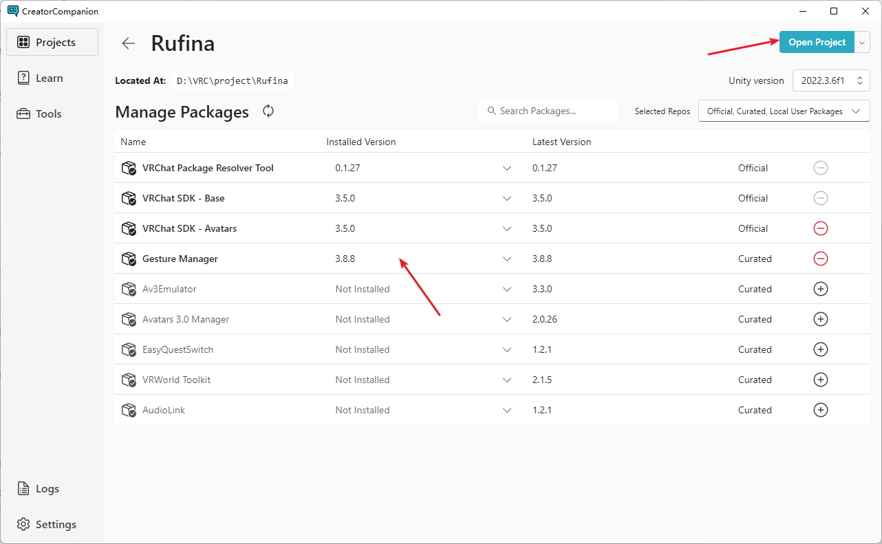 在点击创建项目后有一系列package可供安装,这里强烈建议安装Gesture Manager插件,我们从下拉栏目中选择最新的版本安装,然后点击open project打开工程