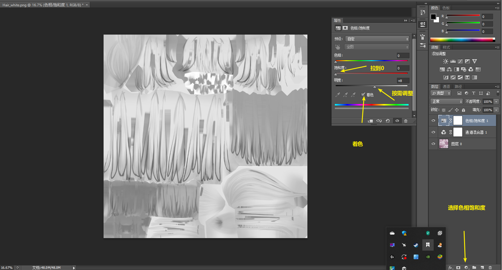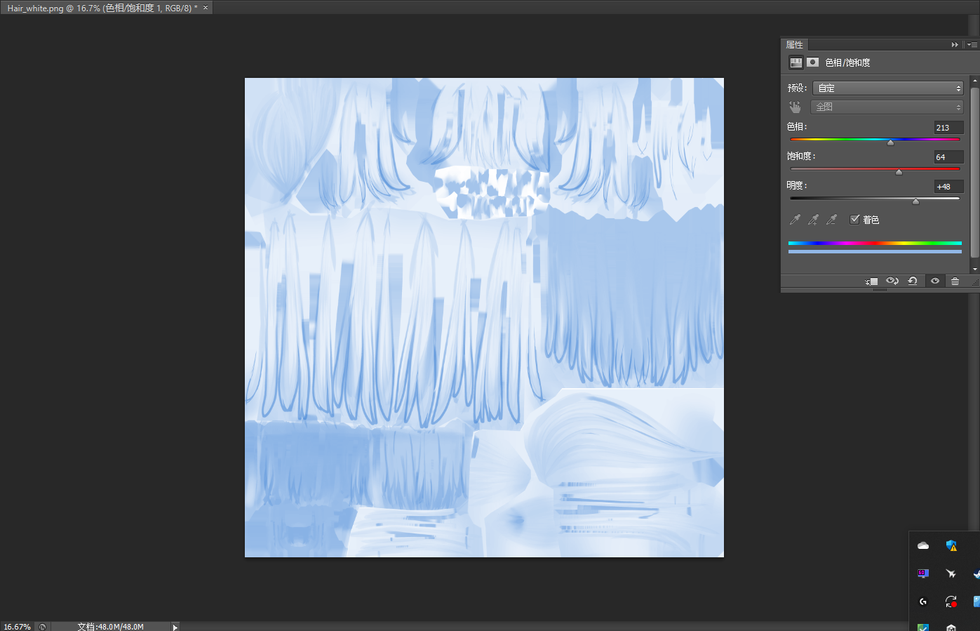 更改颜色的话我这里已经达到白毛目的不需要更改了,不过需要更改在色相饱和度里面同样调整色相和饱和度就可以了。比如说我想要一个蓝毛,就可以。再调整完毕后我们仍然保存为png格式并且返回到unity里面