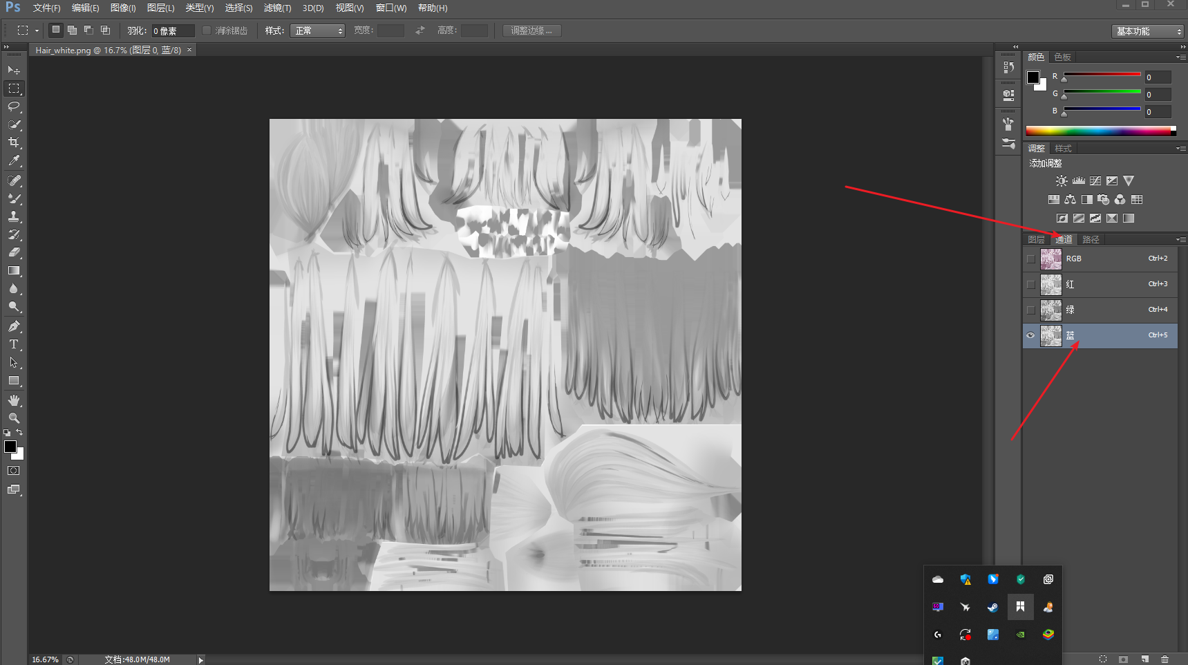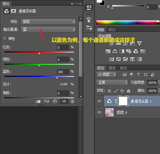 在通道里选择一个看上去最想要的颜色(我觉得蓝色通道这个银白色就很好看所以我们这里选择以蓝色通道为例子),然后我们在图层里面新建一个通道混合器,并且在各个通道里面都把蓝色拉到100,把其他两个颜色调到0(如果不知道我在说什么可以先去B站等平台简单看下对应的ps教程。。。)
