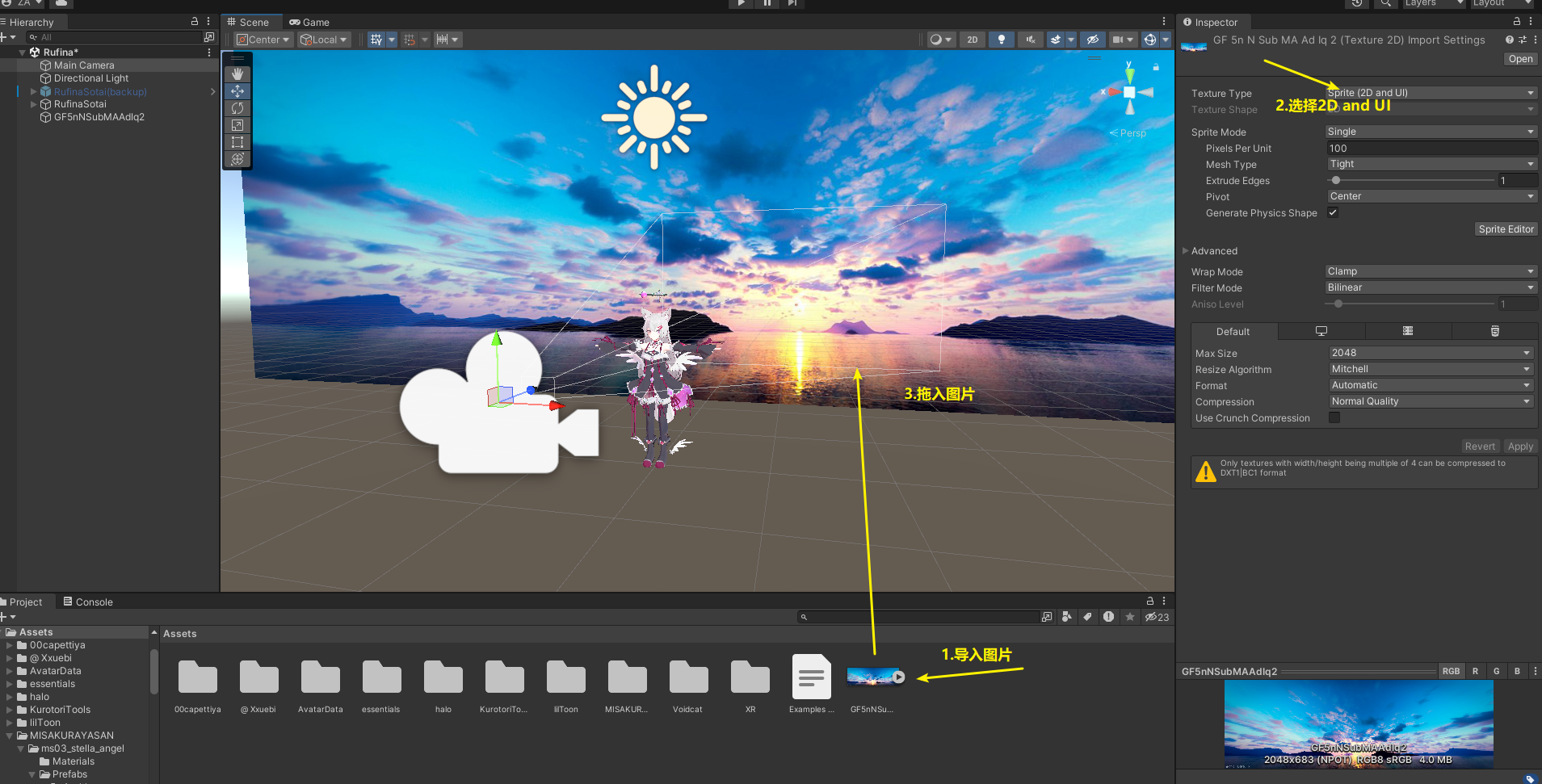 我们首先点击那个摄影机,将它折腾到一个适合的位置,在右下角的取景框可以看到拍摄的样子。这个样子就是马上要上传的模型的头像了。我们还可以从外部引入图片作为背景板(如果需要镜像可以自行进行镜像操作,只需要将Rotation的Y轴值调整至180即可)