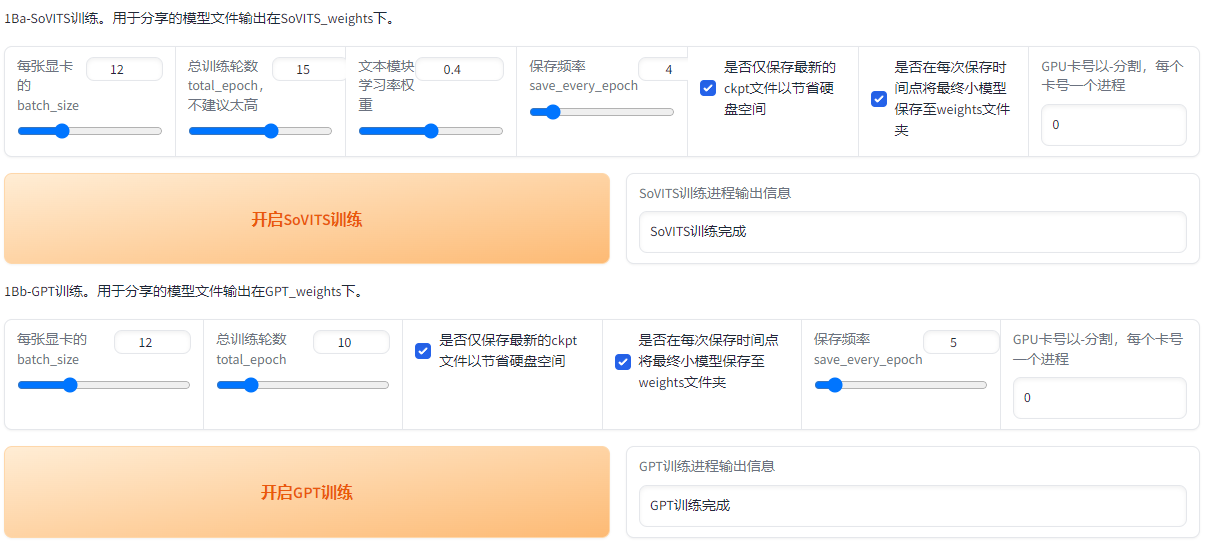 接着设置轮数,SoVITS模型轮数可以设置的高一点,反正训练的很快。GPT模型轮数千万不能高于20(一般情况下)建议设置10。然后先点开启SoVITS训练,训练完后再点开启GPT训练,不可以一起训练(除非你有两张卡)!如果中途中断了,直接再点开始训练就好了,会从最近的保存点开始训练。