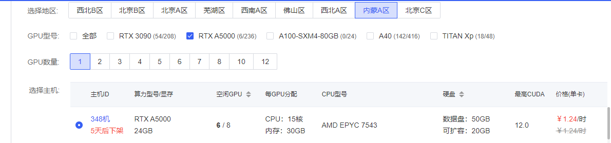 我这里选择了内蒙区的A5000,比较适中的价格和还可以的算力,非常完美,唯一美中不足的就是有的时候可能会没有卡