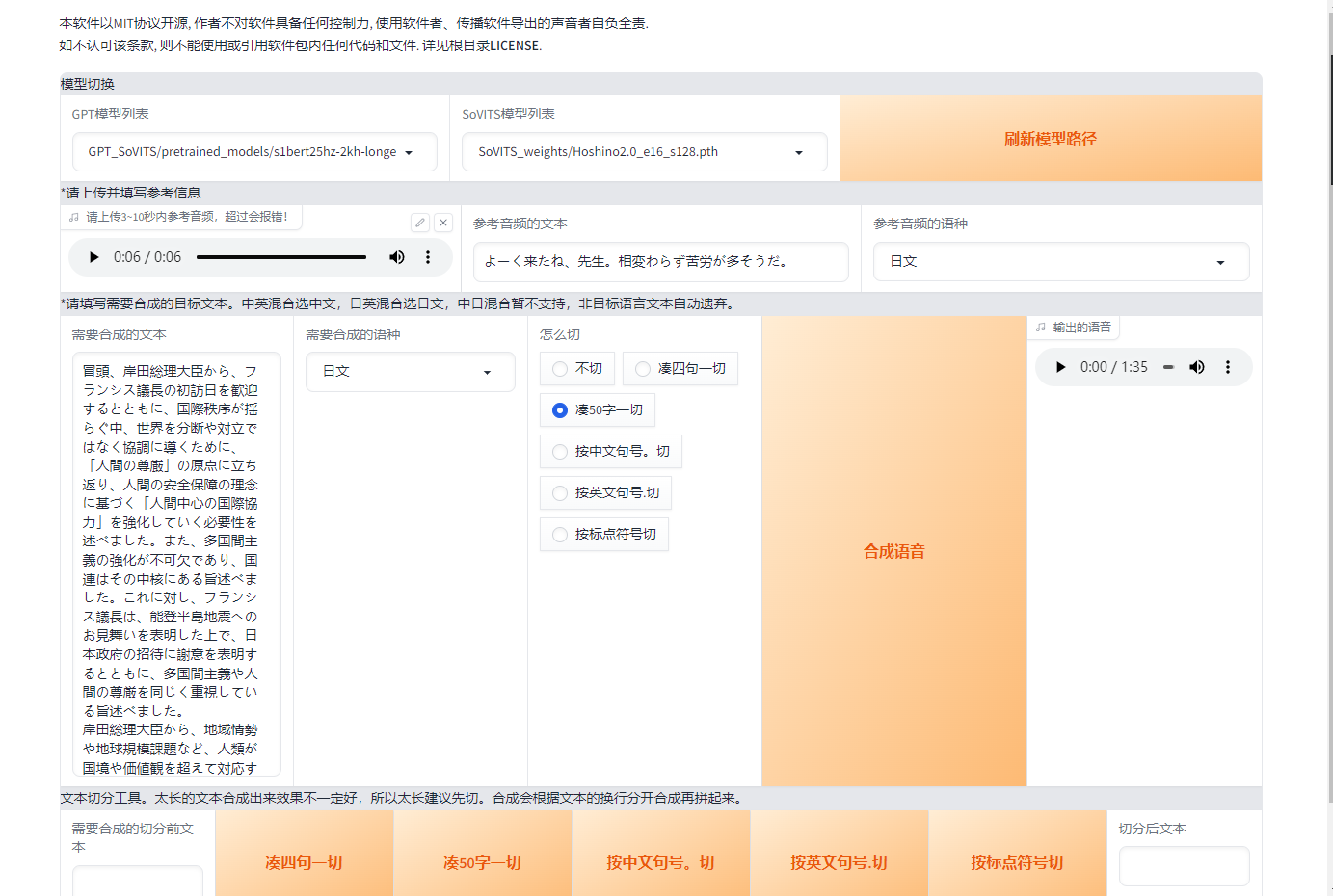 接着就是输入要合成的文本了,注意语种要对应。目前可以中英混合,语种选择中文,日英混合,语种选择日文。切分建议无脑选50字一切,低于50字的不会切。如果50字一切报错的话就是显存太小了可以按句号切。如果不切,显存越大能合成的越多,实测4090大约1000字,但已经胡言乱语了,所以哪怕你是4090也建议切分生成。合成的过长很容易胡言乱语。如果出现吞字,重复,参考音频混入的情况,这是正常现象。不是模型炼差了,不用为模型担心。改善的方法有使用较低轮数的GPT模型、合成文本再短点、换参考音频。官方也在努力修复这个问题。
